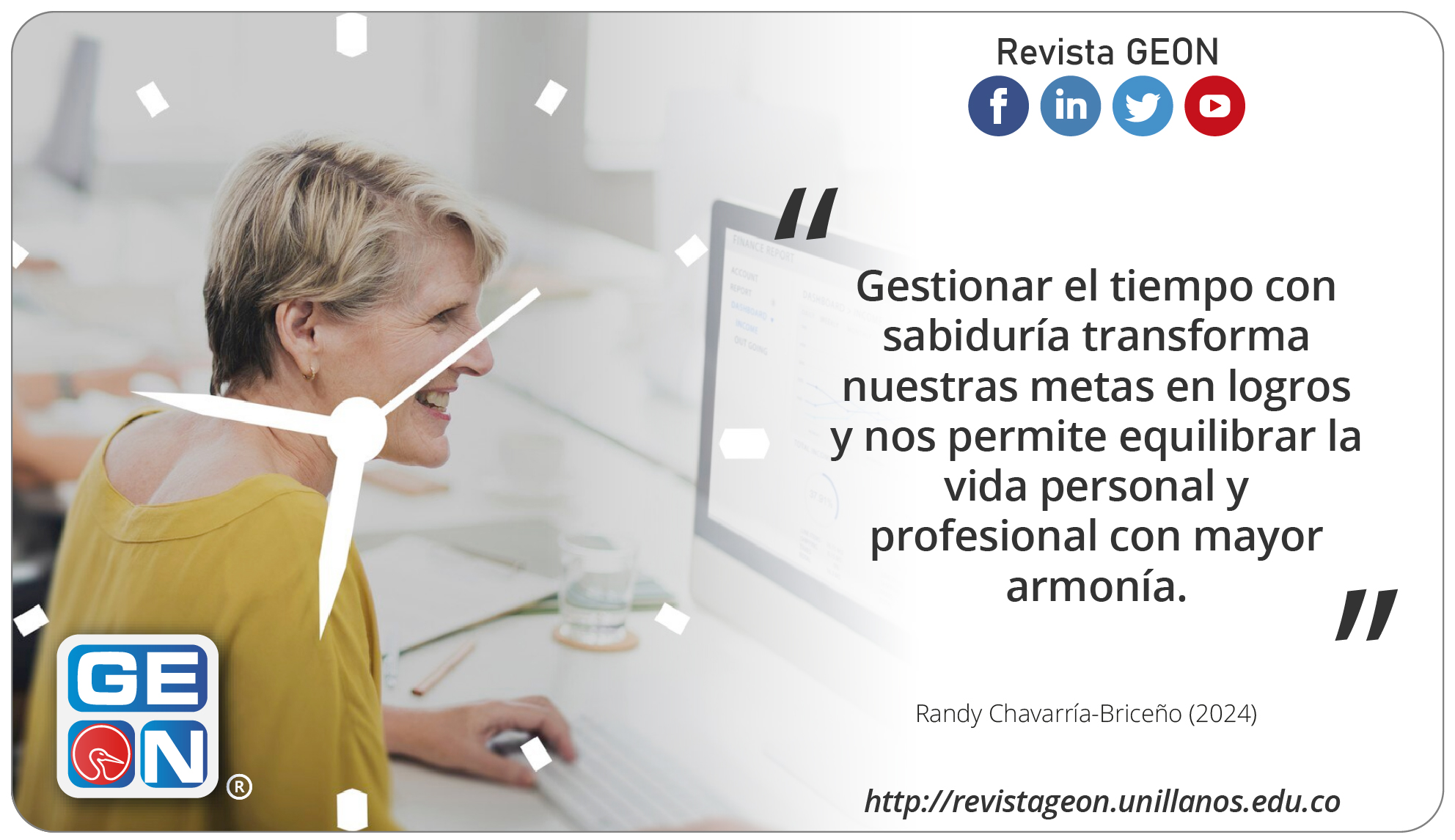 Problemática.La gestión del tiempo es un desafíocomún que implica equilibrar múltiples tareas y prioridades en un día. Sin una planificación eficaz, las personas pueden experimentar estrés yrendimiento reducido, afectando tanto a la vida personal como profesional.Objetivos.Evidenciar el uso de este recurso invaluable para lograr un equilibrio entre las diferentes actividades y responsabilidades, maximizando la productividad y el rendimiento.Materiales y método.Se implementa una metodología de revisión bibliográfica que implica la búsqueda y análisis de fuentes académicas relevantes, como artículos científicos y textos, en plataformas reconocidas, con el fin de identificar tendencias, conceptos clave y mejores prácticas en la organización y optimización del tiempo. Resultados. Es un conjunto de habilidades, técnicas y estrategias que permiten optimizar el tiempo y alcanzar objetivos de manera eficiente y eficaz, brindándonos cinco aspectos fundamentales para lograr un equilibrio entre la vida personal y profesional. Discusión. En la gestión del tiempo se organizan las tareas y responsabilidades para lograr objetivos con eficiencia y armonía. Planificar, priorizar y establecer plazos, transforman el tiempo en un aliado que nos impulsa hacia el éxito. Delegar cuando es necesario, liberando espacio nos permite enfocarnos en lo esencial. Monitoreamos nuestro progreso, ajustando estrategias cuando sea necesario para optimizar cada minuto. Conclusiones. Es esencial para el éxito en cualquier aspecto de la vida; cuando se planifica y se utiliza de manera efectiva, se pueden lograr grandes metas y disfrutar de una vida equilibrada. Aprender a priorizar y a organizarse adecuadamente son habilidades clave. Contribución. En la sinfonía de la vida, el tiempo es el director que marca el ritmo, gestionarlo con sabiduría nos convierte en maestros de nuestra propia orquesta, permitiéndonos componer una melodía de logros y satisfacción. Al dominar este arte, convertimos el tiempo en un recurso invaluable que nos permite alcanzar nuestras metas y disfrutar de una vida plena y significativa.